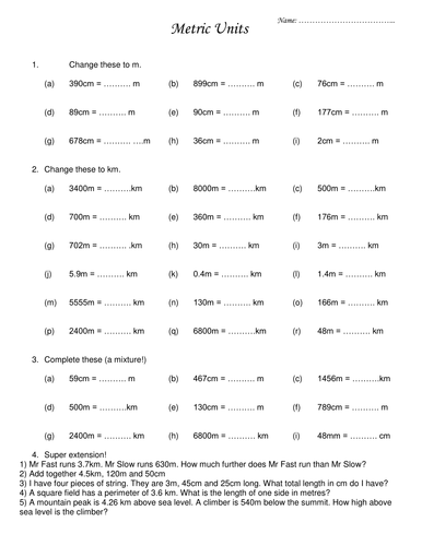 Converting Metric Units Word Problems Worksheet Speed = Distance / Time. Speed = 15840/45. Speed = 352 meters per minute. So, the speed of Mark is 352 meters per minute. Problem 3 : Use a fraction to find the length in meters of a tile that is 9 centimeters long. Solution : Here, we convert smaller unit (centimeters) into bigger unit (meters). So we have to divide. Metric measurements worksheet School subject: math Grade/level: 5 Age: 9-12 Main content: Metric conversions Other contents: Add to my workbooks (0) Download file pdf ... More Metric conversions interactive worksheets. Metric Conversionsh by arul: Metric Conversions Practice by aduckworth: Volume by rsudhir: Metric Conversions by Miss_Tamanna: Grade 5 Cm, m, mm